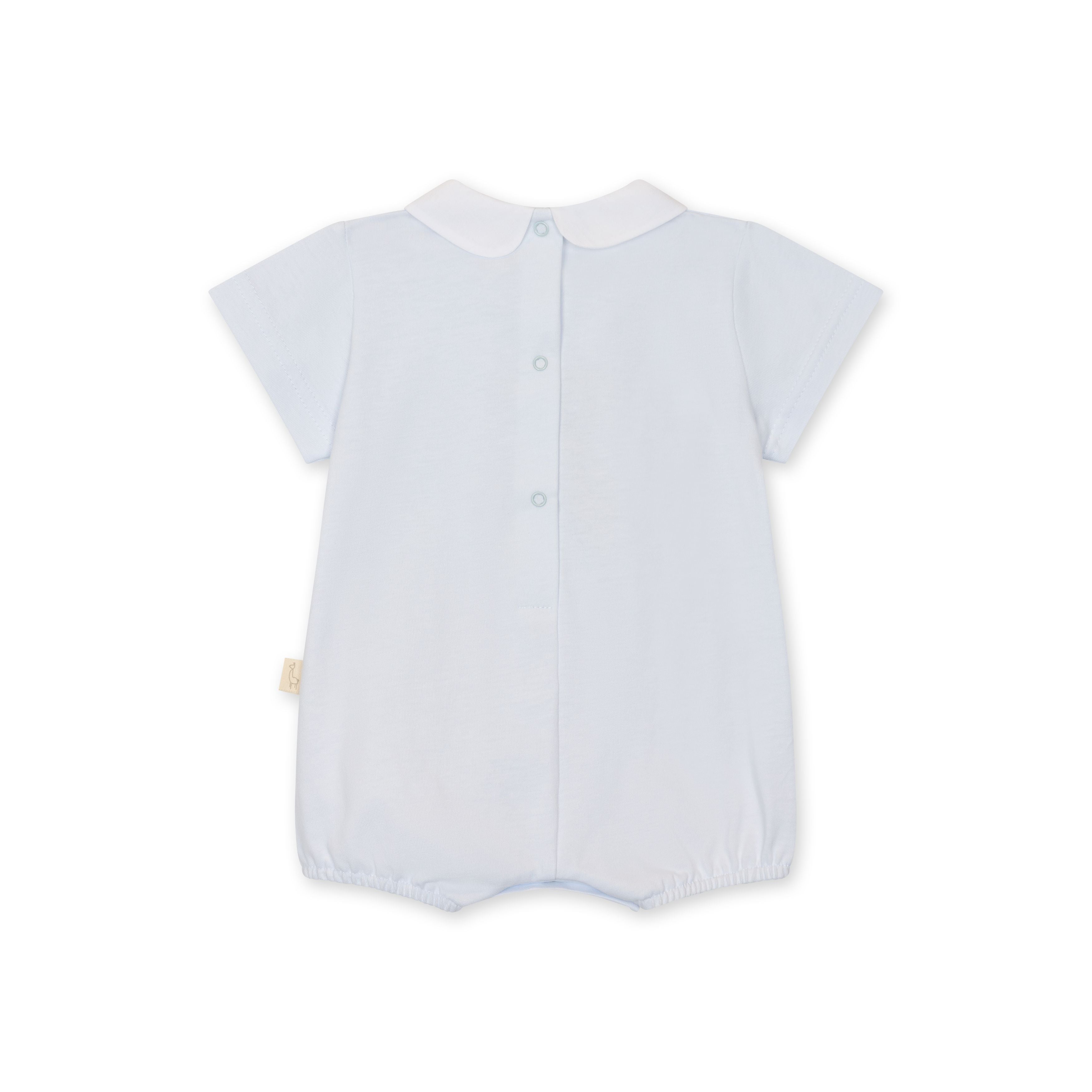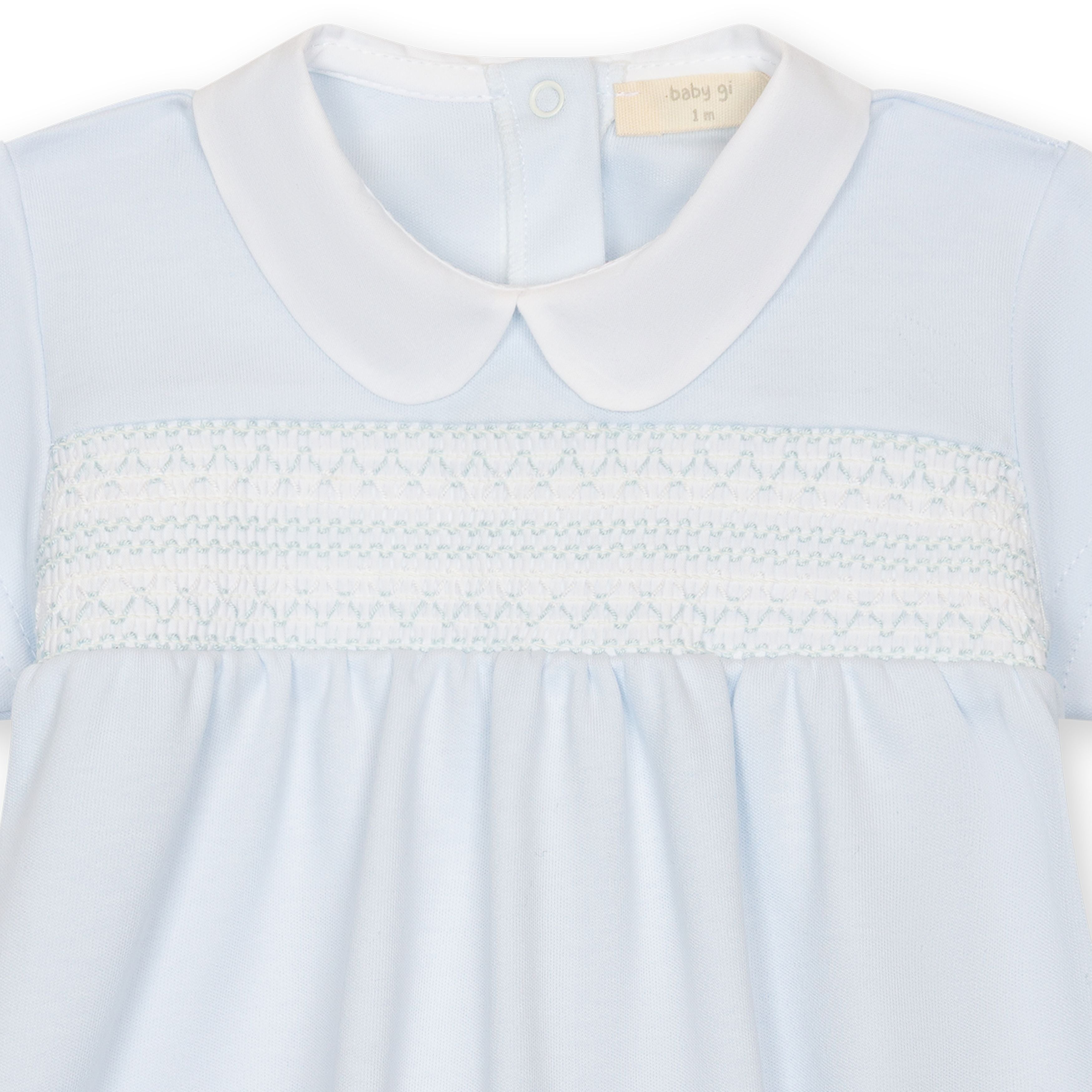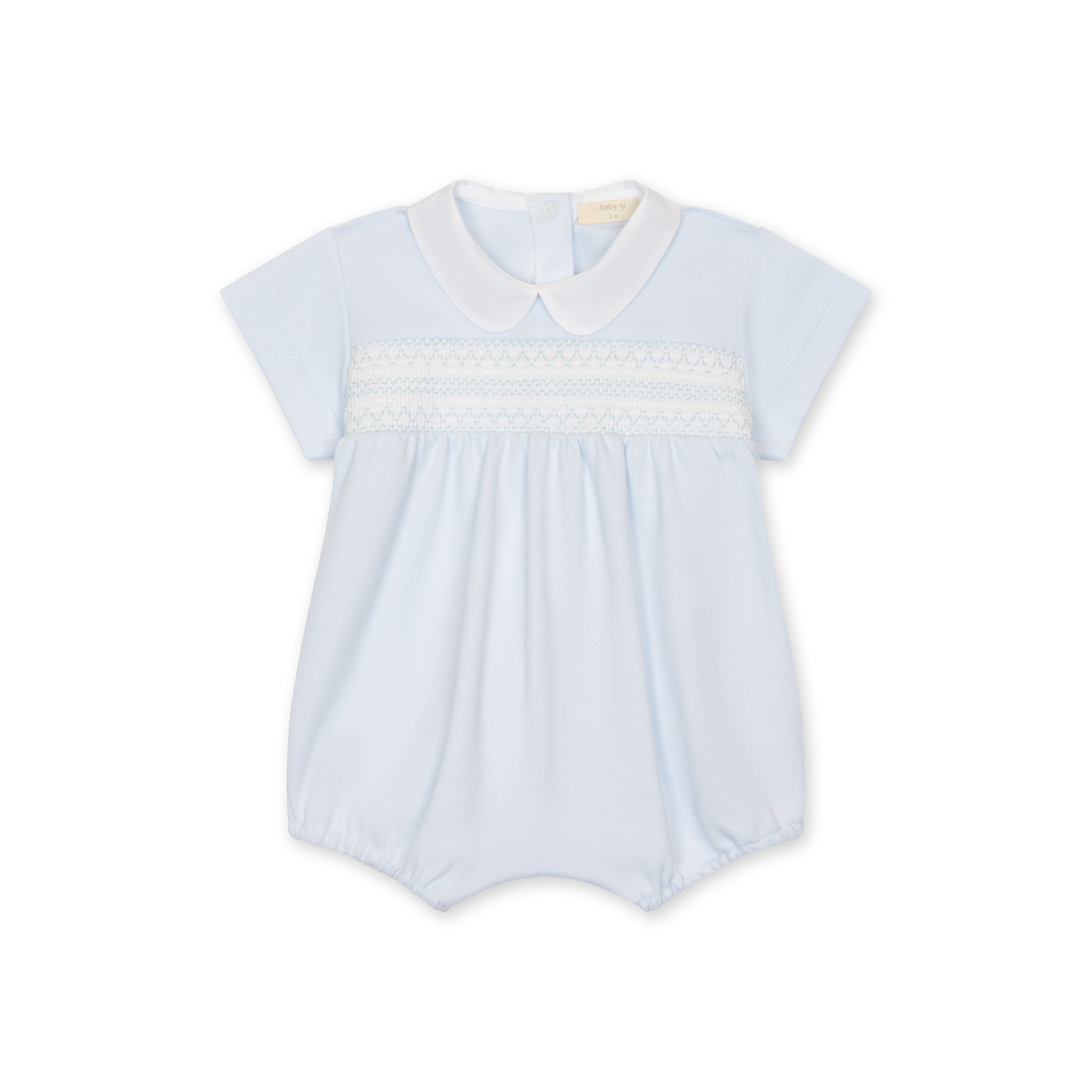 Baby Gi Boys Blue smocked Romper SS26 - is backordered and will ship as soon as it is back in stock.