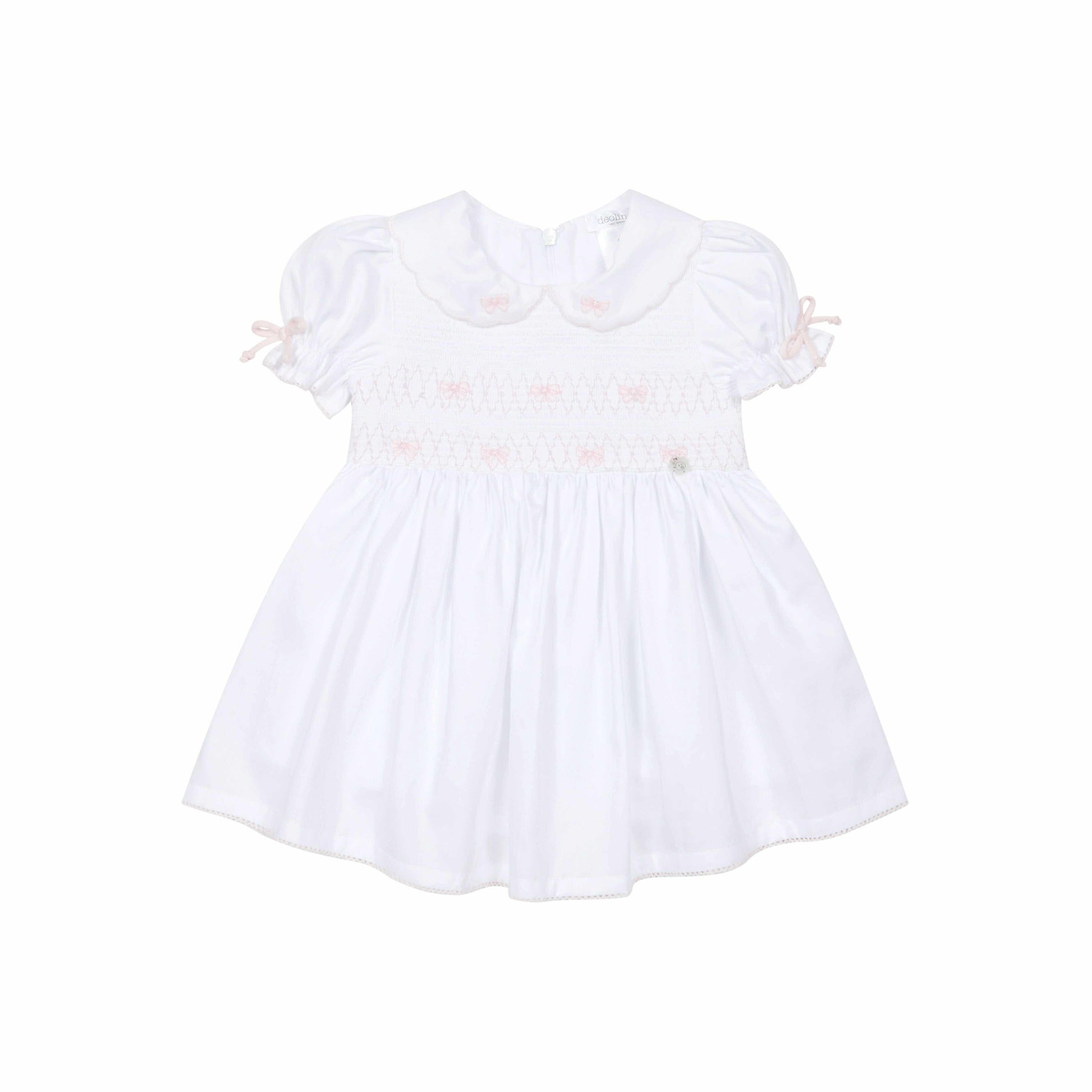 white deolinda dress piped in pale pink with smock detail